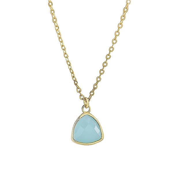 Introducing our stunning lab created aquamarine pendant necklace, featuring a unique triangle shape with multi-faceted cuts that beautifully reflect the light. The teal green color of the gemstone exudes a calming and serene energy, reminiscent of the tranquil waters of the sea. Crafted with exceptional quality and attention to detail, the pendant is secured in 18K gold plated set, providing a lustrous and luxurious finish. The necklace chain is also plated with 18K gold, ensuring a cohesive and elegant look. This necklace is not only beautiful, but also environmentally conscious as it features a lab created aquamarine, which has been sustainably produced with minimal environmental impact. This stunning pendant necklace comes packaged in a chic and eco-friendly paper packaging, making it a great gift for yourself or someone special. Perfect for everyday wear or special occasions, this necklace is sure to make a statement and elevate any outfit. Don’t miss out on adding this timeless and unique piece to your jewelry collection.
